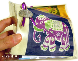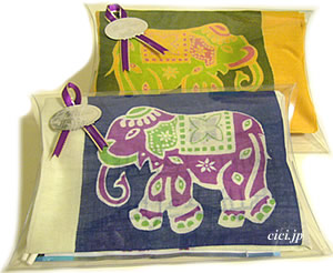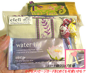 ・透明ギフトケースに、インド綿の象さんハンカチ、バス・アロマ、キャンディ、そしてハート付クリップが入った、