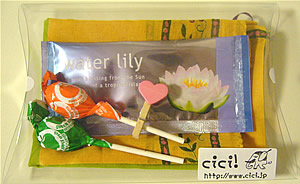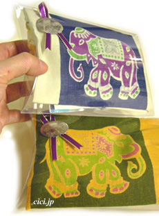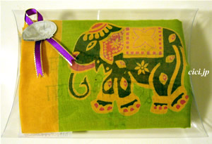 ・透明ギフトケースに、インド綿の象さんハンカチ、バス・アロマ、キャンディ、そしてハート付クリップが入った、