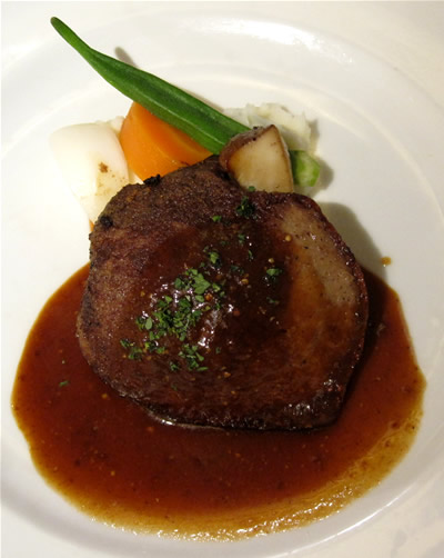 キッシュの場合は、これがメインディッシュになるのですが、お肉やお魚と違って卵ですから、ボリュームが一番少ない点が、私には少々物足りないです。 この店に来たら、基本は肉料理じゃないかなーと思います。お魚党の私ですが、ここではいつもお肉料理を食べています。 下の写真は、レバー肉。 外側がパリっとしてて、中は赤くて柔らかい。臭みは、ゼロです。 更に、デザートは、珈琲とセットで、+300円。 コストパフォーマンスは抜群です。